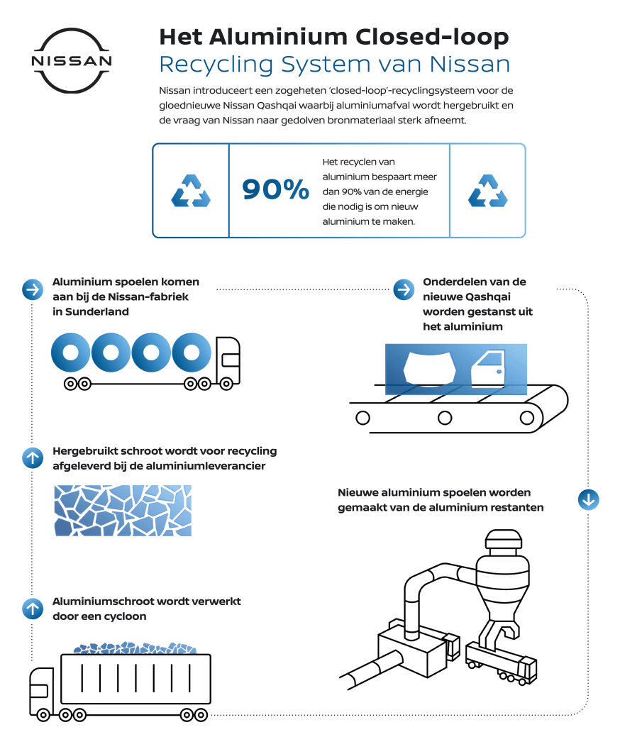 Zo is de ‘closed-loop’-cyclus rond, is er minder afval en reduceert de CO2-uitstoot. Dit past perfect in het streven van Nissan om in 2050 CO2-neutraliteit te bereiken in de activiteiten van het bedrijf en de levenscyclus van haar producten. Recycling van aluminiumschroot bespaart meer dan 90% van de energie die nodig is om een vergelijkbare hoeveelheid aluminium uit grondstoffen te halen.