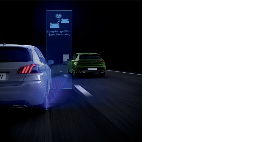Dankzij ultrasone radars met groot bereik kan het dodehoekbewakingssysteem van de nieuwe PEUGEOT 308 een van achteren naderend voertuig tot op 75 meter afstand detecteren, tegenover 25 meter voor een conventioneel systeem. Hierdoor wordt de bestuurder eerder gewaarschuwd - met een knippersignaal in de buitenspiegel - voor een auto of motorfiets in de dode hoek. Dankzij het grotere bereik biedt het systeem bewaking die zowel de rechter- als de linkerrijstrook van de nieuwe PEUGEOT 308 bestrijkt.