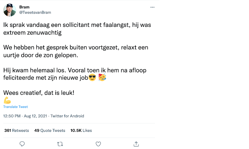 Iedereen herkent de zenuwen die door je lichaam gieren wanneer je een sollicitatiegesprek hebt. Bram voelde aan wat zijn sollicitant nodig had, wat resulteerde in een win-win situatie.