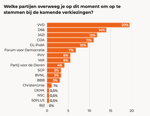 - Voorkeurswetgeving: respondenten verdelen hun voorkeur over Wetsvoorstel VBAR, Wetsvoorstel Zelfstandigenwet, en het volledig schrappen van de Wet DBA. Een groot deel kiest het schrappen van de wet, en schaart zich daarbij onder FvD, BBB en BVNL. Ook is er duidelijk meer steun voor Wetsvoorstel Zelfstandigenwet dan voor de VBAR.