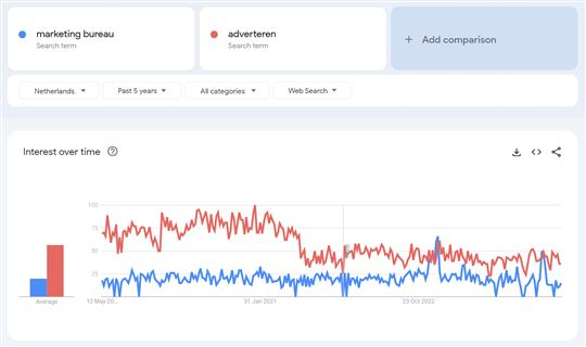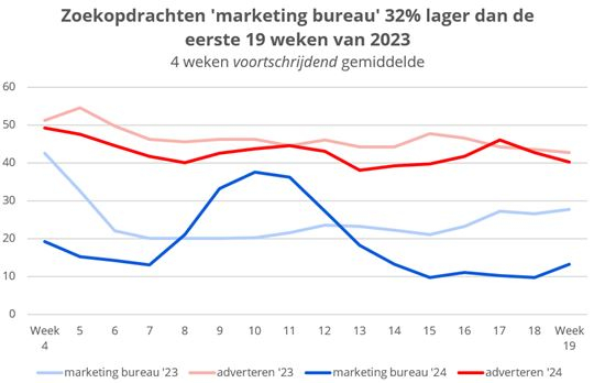 Uit de geëxporteerde data blijkt dat er een daling is, in de eerste 19 weken van 2024 vergeleken met diezelfde weken van 2023, van 32% voor zoekopdrachten met het woord ‘marketing bureau’ erin en 8% lager voor zoekopdrachten met het woord ‘adverteren’ erin.