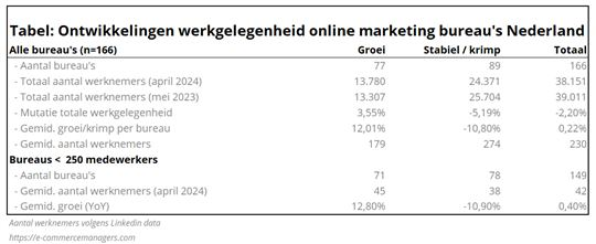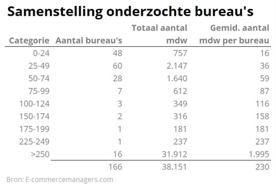 Er zijn natuurlijk ook 77 bureaus die een stevige groei hebben laten zien. "Het verschil tussen de twee groepen bureaus moet nader onderzocht worden want wij hebben in eerste instantie geen structurele verschillen kunnen vinden. Maar de netto daling van de werkgelegenheid van 2% blijft iets om aandacht voor te houden" aldus Joost Hoogstrate, directeur van E-commercemanagers.com.
