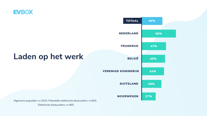 Momenteel laden de meeste mensen in Europa hun elektrische auto thuis (73 procent) en op het werk (40 procent) op. Toch geeft 29 procent van de elektrische bestuurders aan dat er op het werk niet altijd plek is om te laden. 20 procent van hen heeft helemaal geen mogelijkheid om te laden op het werk. In de toekomst ziet 32 procent van de elektrische bestuurders ook graag meer snelladers op het werk.