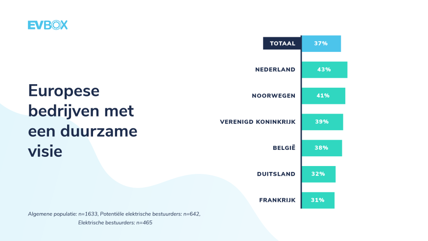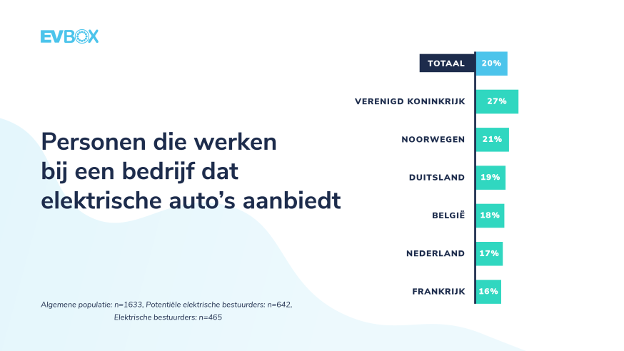 Het onderzoek wijst uit dat slechts 17% van de Nederlandse respondenten voor een bedrijf werkt dat elektrische leaseauto’s beschikbaar stelt. Ter vergelijking: in het Verenigd Koninkrijk biedt 27 procent van de bedrijven een elektrische auto aan en in Noorwegen is dit 21 procent. België (18 procent) en Frankrijk (16 procent) scoren samen met Nederland het slechtst. Eind 2019 bleek al dat Nederlandse werkgevers hun werknemers amper aansturen op het gebruik van volledig elektrische of hybride auto’s. Van de Nederlanders die graag elektrisch willen gaan rijden, is 52 procent op zoek naar een werkgever die elektrische auto’s als optie biedt. Ook in België (55 procent), het Verenigd Koninkrijk (52 procent) en Duitsland (48 procent) is dit het geval.