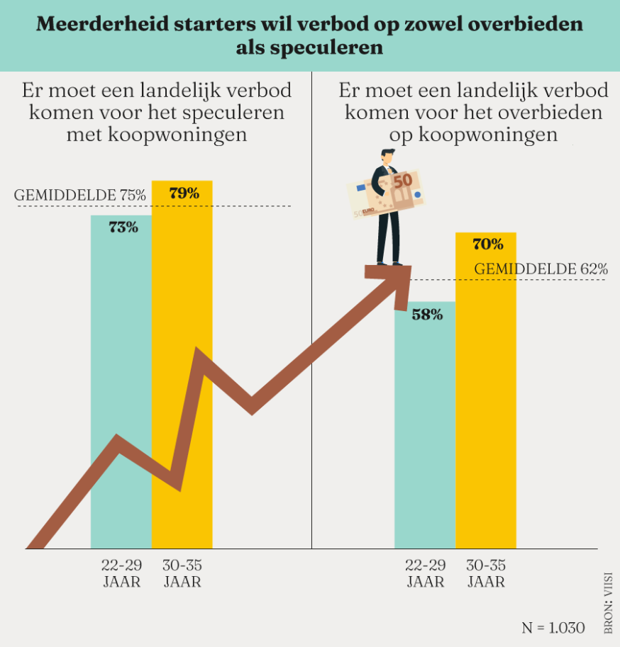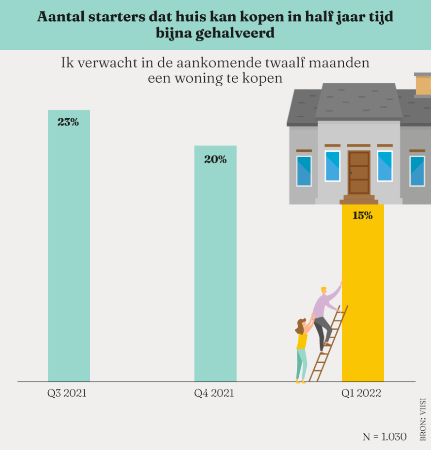 Nog maar vijftien procent van alle starters op de Nederlandse woningmarkt verwacht in de komende twaalf maanden hun eerste huis te kopen. Een kwartaal geleden gold dit nog voor ruim twintig procent van de koopstarters. Dit blijkt uit de startersbarometer Q1 2022 van Viisi Hypotheken, een periodiek onderzoek, deze keer onder 1.030 Nederlanders tussen de 22 en 35 jaar oud zonder koopwoning, uitgevoerd door PanelWizard. Maar liefst 62 procent van alle ondervraagden vindt dat er een verbod moet komen op het overbieden op koopwoningen, om zo hun (toekomstige) positie op de woningmarkt te verbeteren.