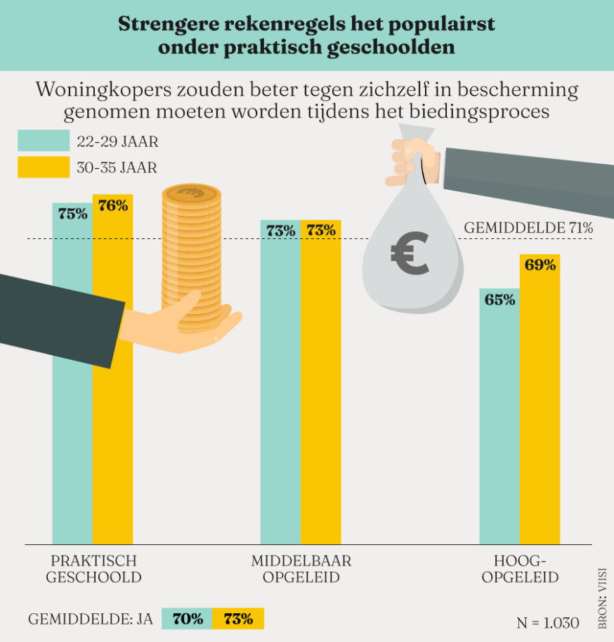 Uit het onderzoek blijkt verder dat maar liefst 94 procent van alle Nederlandse starters een voorstander is van meer transparantie rondom de aankoop van een nieuwe woning. Daarbij gaat het zowel om een helder biedingsproces als de informatievoorziening voorafgaand aan en tijdens het koopproces. Zo stelt 63 procent van de ondervraagden dat zij graag meer voorlichting willen krijgen over de aankoop van een (eerste) woning. Erg opvallend is hierbij het verschil tussen hoogopgeleiden (68 procent) en praktisch geschoolden (54 procent). Dutrieux: “De aankoop van een nieuwe woning is voor de meeste mensen de grootste uitgave die zij ooit zullen doen. Zo’n beslissing kun je niet lichtvaardig nemen. Het is daarom zorgwekkend dat veel mensen vinden dat de voorlichting tekortschiet.”