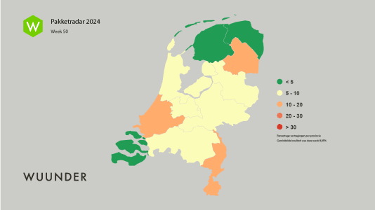 De rust voor vervoerders is tijdelijk wedergekeerd na de drukke periode met Black Friday en Pakjesavond. Het aantal zendingen met vertraging is met bijna een vijfde (17,5%) gedaald in een week tijd. In week 49 was namelijk nog 25,5 procent van de zendingen vertraagd, terwijl dit afgelopen week nog maar om 8,05 procent ging. Dat blijkt uit de Pakketradar, een data-analyse van Wuunder. Het aantal vertraagde pakketten ligt nét iets hoger dan vorig jaar in dezelfde week: toen ging het om 7,4 procent van de zendingen.