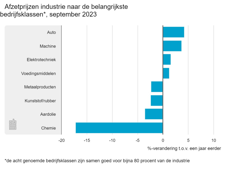 Producten van de aardolie-industrie waren in september 3,5 procent goedkoper dan in september 2022. In augustus lagen de prijzen 14,8 procent lager dan een jaar eerder. Ook in de chemische industrie hangt de afzetprijs over het algemeen samen met de olieprijs. De afzetprijzen van de chemische industrie waren in september 17,2 procent lager dan een jaar eerder. In augustus lagen de prijzen 19,6 procent lager dan in augustus 2022.