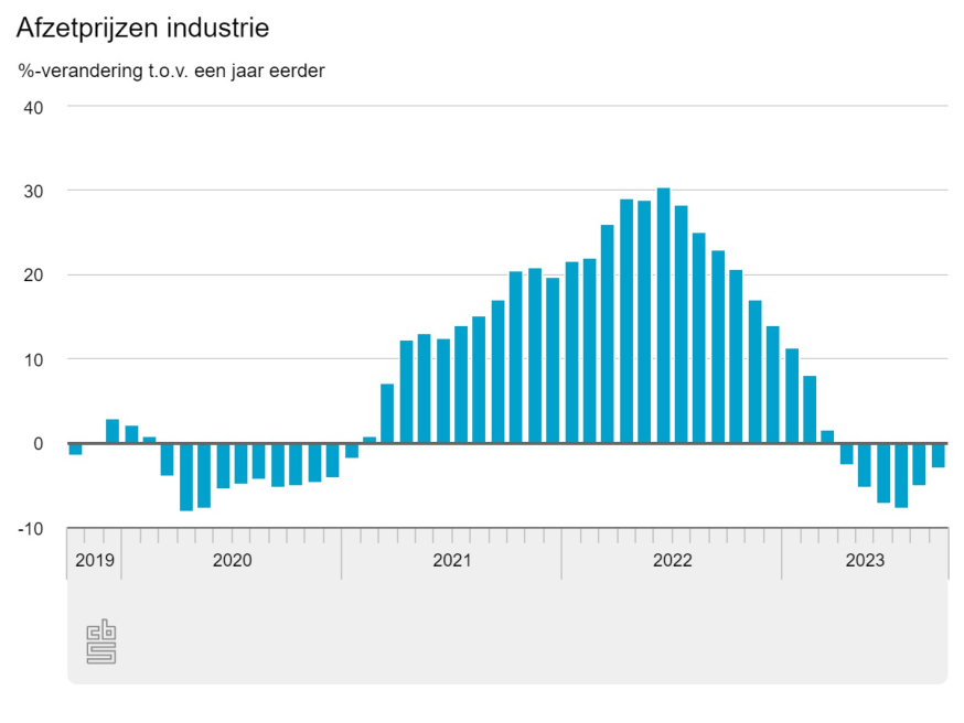 De afzetprijzen van de Nederlandse industrie waren in september gemiddeld 3,0 procent lager dan in september 2022, meldt het CBS. Een maand eerder was de prijsdaling 5,0 procent.