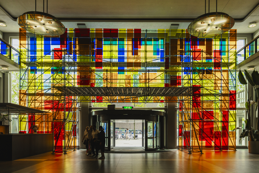 Afgelopen lente is een initiatief van start gegaan dat kunst en bouw combineert. Dit project levert opnieuw een bijzondere bijdrage aan de artistieke uitstraling van het Groot Handelsgebouw. De kleurrijke boog, geïnspireerd op de architectuur van het Groot Handelsgebouw, verwelkomt bezoekers en huurders en verandert hun kijk op het gebouw en de toekomst ervan. De installatie in de lobby transformeert de ruimte in een regenboog van schaduwen en kleuren wanneer de zon door het kleurrijke materiaal schijnt.