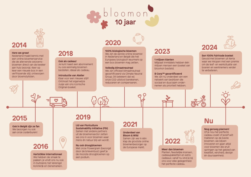 In de afgelopen 10 jaar heeft bloomon naam gemaakt met unieke boeketten, speciaal ontworpen door bloemstylisten en bezorgd met een 10 dagen versgarantie. Met de limited edition Original collectie en een succesvolle verjaardagstour achter de rug kijkt bloomon uit naar nog meer jaren vol bloei en geluksmomenten met bloemen.
