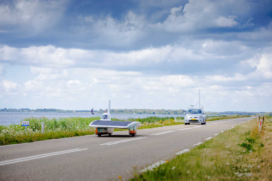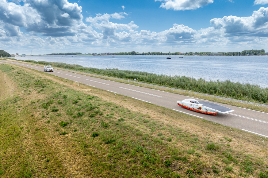 Brunel Solar Team test aerodynamica zonneauto op Eemmeerdijk (N704)
