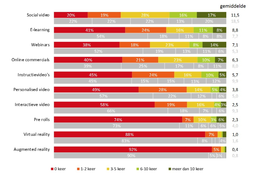 Ook de inzet van e-learning nam toe. 35 procent van de marketeers produceerde minstens drie keer online video voor e-learning projecten; in 2019 was dat nog 27 procent. Niet alle categorieën van online video namen overigens toe in gebruik. Minder bedrijven zetten video in voor virtual reality. En hoewel iets meer bedrijven content produceerden voor social media, deden zij dit minder vaak. In 2019 zei 20 procent van de marketeers tien of méér video’s te maken voor social kanalen, in 2020 was dat 17 procent.