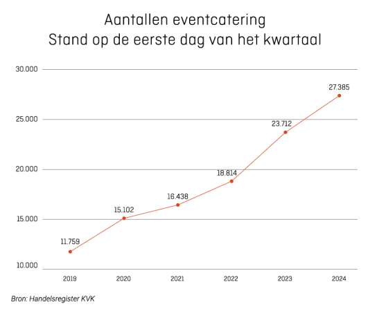 Het evenementenseizoen is weer gestart, en er staat dit jaar opnieuw een grote hoeveelheid eventcateraars klaar om festivals, bruiloften, verjaardagen en andere feesten te verzorgen. Het handelsregister van de Kamer van Koophandel telde er in het eerste kwartaal van 2024 ruim 27.000, dat zijn er bijna 16.000 meer dan vijf jaar geleden +133%.
