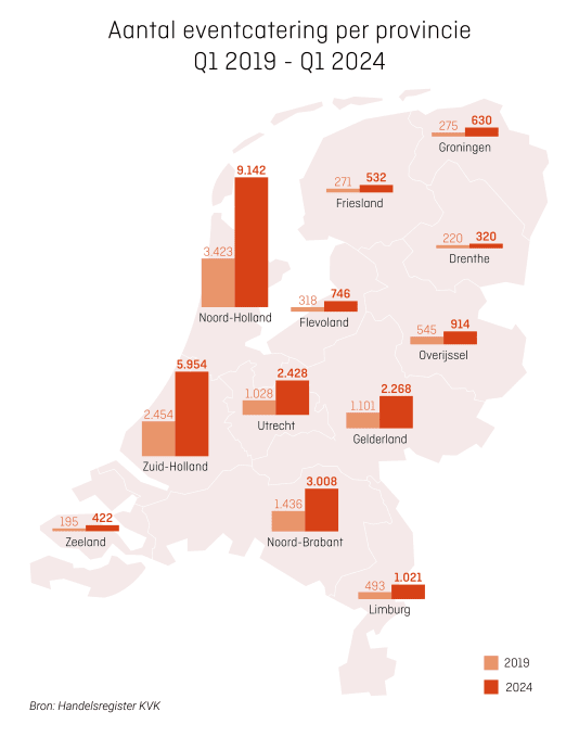 In Noord-Holland, Zuid-Holland en Utrecht is de toename procentueel gezien het grootst. Respectievelijk steeg het aantal hier met 167%, 143% en 136% en komen de aantallen op 1 januari 2024 op 9.142, 5.954 en 2.428. In Zeeland zijn relatief weinig eventcateraars te vinden, toch heeft hier met een toename van 116% een flinke stijging plaatsgevonden.