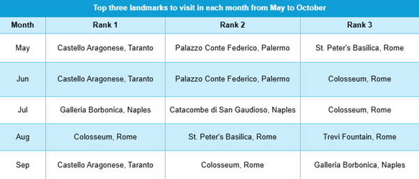 - Castello Aragonese, Taranto staat bovenaan in drie van de vijf zomermaanden, waaronder mei, juni en september