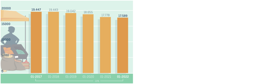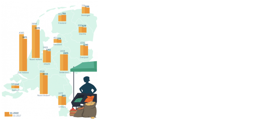 Op de markt is je gulden een daalder waard. De gulden is vervangen door de euro, maar de markt is er nog wel. Hopelijk blijft dat ook zo, want de laatste 5 jaar zien we een geleidelijke afname van het aantal bedrijven die op de markt staan. In 2017 telde het KVK Handelsregister bijna 19.500 bedrijven in de ambulante handel, de officiële term voor verkoop op openbare markten, aan huis of op de openbare weg. Anno 2022 zijn dit er nog maar 17.589. Een afname van 10% in 5 jaar tijd. Martie Bleeker, secretaris van de Centrale Vereniging voor de Ambulante Handel (CVAH) verwacht dat het aantal ambulante handelaren nu stabiliseert. Een nieuwe generatie marktondernemers trekt klanten naar de markt met gezonde en luxere food-producten.