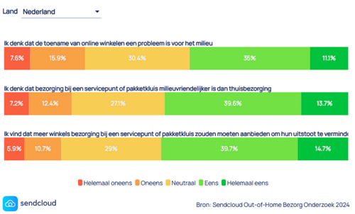 Meer dan de helft van de consumenten (53,3%) gelooft dat levering aan een servicepunt of pakketkluis milieuvriendelijker is dan thuisbezorging. Daarnaast vindt 54,4% dat meer webwinkels out-of-home bezorging zouden moeten aanbieden om hun CO2-uitstoot te beperken.