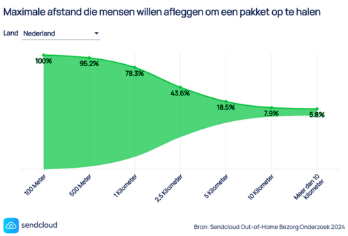 Hoewel consumenten steeds meer oog hebben voor het milieu, blijkt hun gedrag niet altijd consistent. De helft (51,3%) van de Nederlanders gebruikt weleens de auto om een pakket op te halen bij een servicepunt of pakketkluis, terwijl 48,6% de fiets kiest en 44,9% te voet gaat. Ondanks deze verschillen in vervoerswijze is de bereidheid om te reizen duidelijk: 78,3% van de consumenten is bereid om tot een kilometer te reizen om een bestelling op te halen.