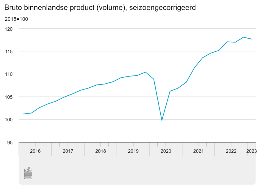 Volgens de tweede berekening van het CBS is het bruto binnenlands product (bbp) in het eerste kwartaal van 2023 met 0,3 procent gedaald ten opzichte van het vierde kwartaal van 2022. De krimp in het eerste kwartaal is vooral toe te schrijven aan een grotere onttrekking uit de voorraden. De tweede berekening van het bbp wordt ongeveer 85 dagen na afloop van het kwartaal gepubliceerd.