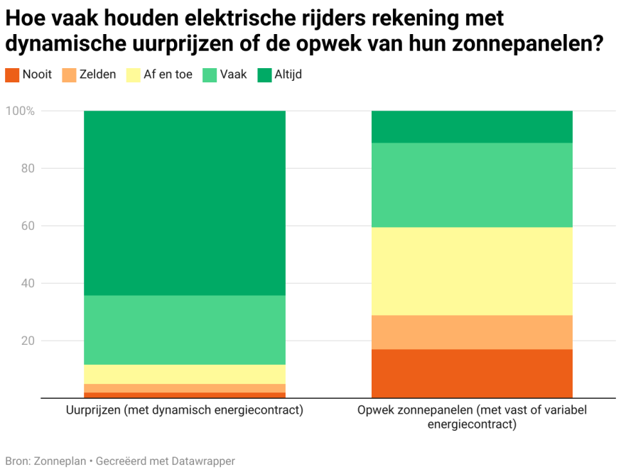 De uurprijzen wegen voor veel elektrische rijders zwaarder dan de opwek van hun zonnepanelen. Zo houden dus bijna negen op de tien EV-rijders met een dynamisch contract bij het opladen vaak of altijd rekening met de uurprijzen. Daarmee laden zij automatisch overwegend duurzaam opgewekte stroom, aangezien veel beschikbare wind- en zonnestroom voor lage prijzen zorgen. Echter, van de ondervraagden met een traditioneel energiecontract en zonnepanelen laadt minder dan de helft bewust op zonnige momenten. Bijna een kwart van hen houdt hier zelfs zelden of nooit rekening mee.