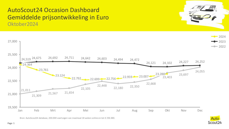 De gemiddelde prijs van een tweedehandsauto in Nederland ligt in oktober op 23.288 euro, waardoor het verschil ten opzichte van een jaar geleden minder groot is. De occasionprijs in oktober 2023 was namelijk 24.101 euro. Ook ligt de prijs grofweg weer op hetzelfde niveau als twee jaar geleden, in oktober 2022 (23.403 euro). Dat blijkt uit de cijfers van AutoScout24, het Europese online autoplatform voor nieuwe en tweedehandsauto’s.