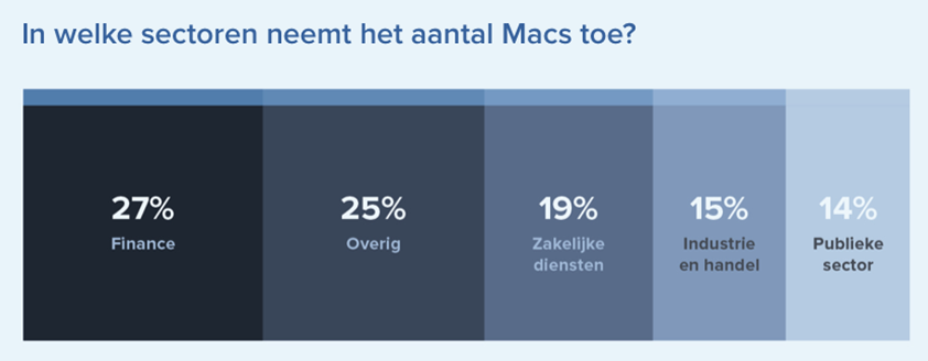 Het aantal Macs zal ook in de komende jaren groeien bij Nederlandse organisaties. Bijna de helft (46%) van ondervraagde organisaties verwacht dat het aandeel Macs zal toenemen. Bij veel organisaties bestaat zelfs een voorkeur om Macs tot de standaard te maken op de werkplek. Slechts 37 procent ziet de Mac niet de standaard voor de hele organisatie worden. Het groeiende aandeel Macs is te vinden in alle sectoren die voor deze survey zijn ondervraagd. Vooral in de financiële dienstverlening (61%) en bij zakelijke dienstverleners (43%) neemt het aantal toe. Maar ook in de industrie en handel (34%) en de publieke sector (32%) zijn steeds vaker Macs te vinden.