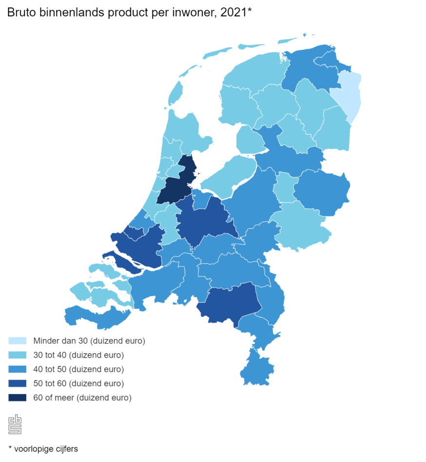 Doorgaans wordt het bruto binnenlands product (bbp) per hoofd van de bevolking gebruikt als een maatstaf hoe ‘welvarend’ een regio is. Deze is relatief hoog in de grootstedelijke regio’s: Groot-Amsterdam, Delft en Westland, Groot-Rijnmond, Utrecht en Zuidoost-Noord-Brabant. Het bbp per hoofd van de bevolking is relatief laag in grote delen van het noorden van Nederland, zoals in Fryslân, en ook in de Achterhoek, Zuidwest-Overijssel, en Overig Zeeland.