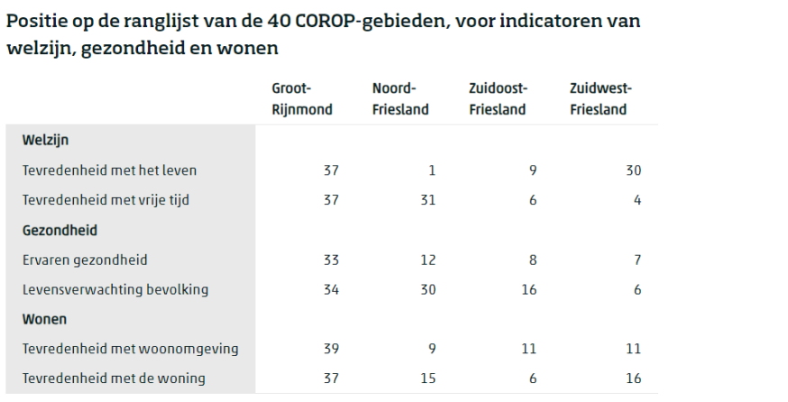 Op het gebied van welzijn, gezondheid en wonen scoren de Friese regio’s relatief goed. De tevredenheid met het leven en de vrije tijd is relatief hoog in Fryslân, en laag in Groot-Rijnmond. Op het gebied van ervaren gezondheid en levensverwachting zit Groot-Rijnmond bij de onderste 10 COROP-gebieden, de Friese gebieden staan hoger op de relatieve ranglijst. Ook op een aantal aspecten rond wonen is het contrast tussen Rijnmond en de Friese gebieden groot: Fryslân staat hier relatief hoog, terwijl de inwoners van Groot-Rijnmond met hun woongenot onderaan de lijst bungelen.