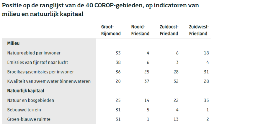 Ook op het gebied van milieu en natuurlijk kapitaal komt Groot-Rijnmond er relatief slecht vanaf. Dit gebied kent een relatief hoge uitstoot van fijnstof en broeikasgassen, zeker vergeleken met de Friese gebieden. Ook qua bebouwing en groen-blauwe ruimte (bossen en parken, en open water) scoort Rijnmond relatief slecht, en Fryslân naar verhouding goed.