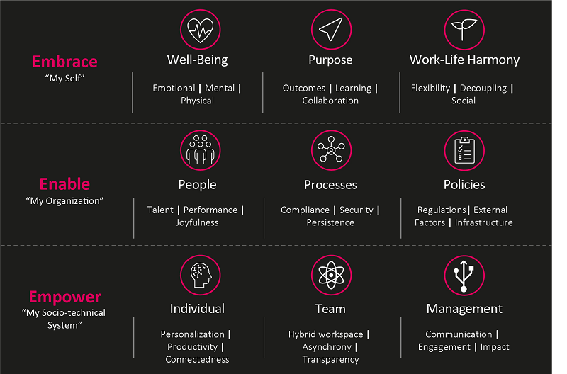 Maar hoe ziet die shift naar hybride werkplek en werkstijl er dan uit? En zijn organisaties en de massale bevolking die bestaan uit meerdere generaties ook klaar voor deze paradigmaverschuiving? Allereerst vraagt deze verschuiving om een hybride model met de flexibiliteit om overal te kunnen werken. Maar belangrijker nog, deze evolutie van de werkplek en werkstijl is niet alleen een verandering op korte termijn, maar een revolutie naar de nieuwe wereld. Het 3E-model van Embrace-Enable-Empower biedt een algemene benadering om een stap vooruit te zetten naar de nieuwe paradigmaverschuiving. De new-age beroepsbevolking heeft de macht en deze groep heeft een gezonde omgeving nodig om in te gedijen en te slagen, dat mag door organisaties niet vergeten worden.