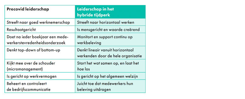 Leiders in tijden van het hybride werken lopen achter de groep, om in het oog te houden hoe het elk individueel groepslid vergaat. Daar waar entiteiten ontstaan die niet of niet meer voldoen aan de waardecreatie van de organisatie, breken zij koninkrijkjes af om nieuwe te kunnen laten ontstaan. De aanjagers van horizontaal werken nemen, anders dan voorheen, de mens en zijn werk als uitgangspunt. Zij initiëren en monitoren daarbij op hygiënefactoren, op motivatiefactoren en op affectie. Het gezamenlijk creëren van waarde op thema’s als klimaat, omgeving, maatschappelijke bijdrage en circulariteit staat daarbij op z’n minst gelijk aan het behalen van goede bedrijfsresultaten. Omdat ook de zogenaamde bedrijfsburgers het gedrag van gewoontedieren vertonen, is gedragsbeïnvloeding wenselijk voor zowel hun eigen welzijn als voor de organisatie. Met gedragsinterventies kunnen ze wendbaar, verbonden, vitaal, blij en veilig worden gehouden.