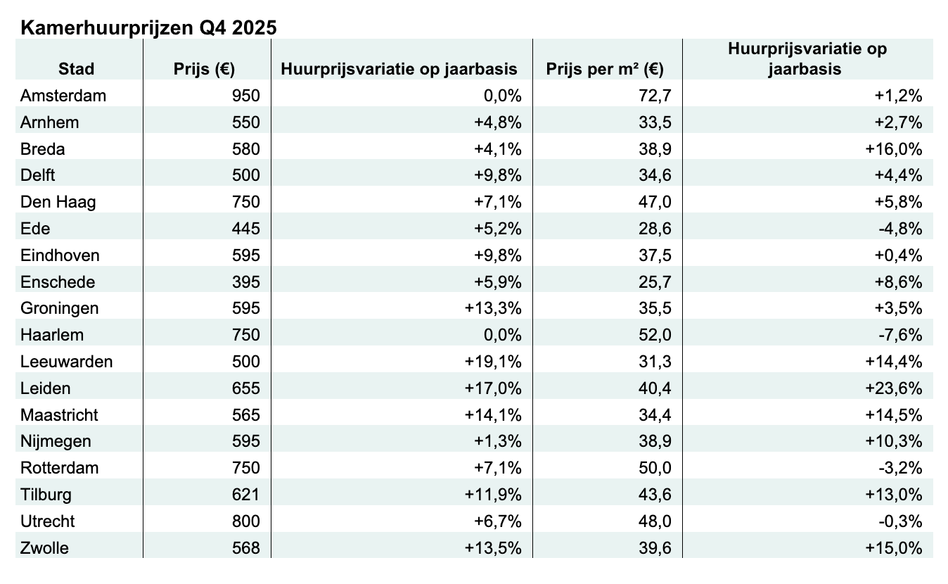 Nu de huurprijzen in de regio Amsterdam stabiliseren, zijn de sterkste stijgingen verschoven naar regionale studentensteden. Leeuwarden gaat aan kop met een stijging van 19,1% op jaarbasis, gevolgd door Leiden (+17%) en Maastricht (+14,1%). Ook in Zwolle (+13,5%) en Groningen (+13,3%) zijn de huurprijzen toegenomen. In deze steden betalen studenten tussen de € 500 per maand in Leeuwarden en € 655 in Leiden voor een kamer.
