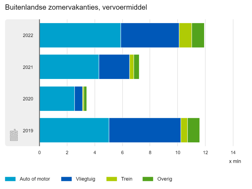 Dat mensen in de zomer dichter bij huis bleven, is ook terug te zien in de gebruikte vervoermiddelen voor buitenlandse vakanties. Er werd minder gevlogen: in 2022 werd voor 4,2 miljoen zomervakanties (35 procent) het vliegtuig genomen. Dat waren er 1,0 miljoen minder dan in 2019, toen het aandeel vliegreizen 45 procent was.