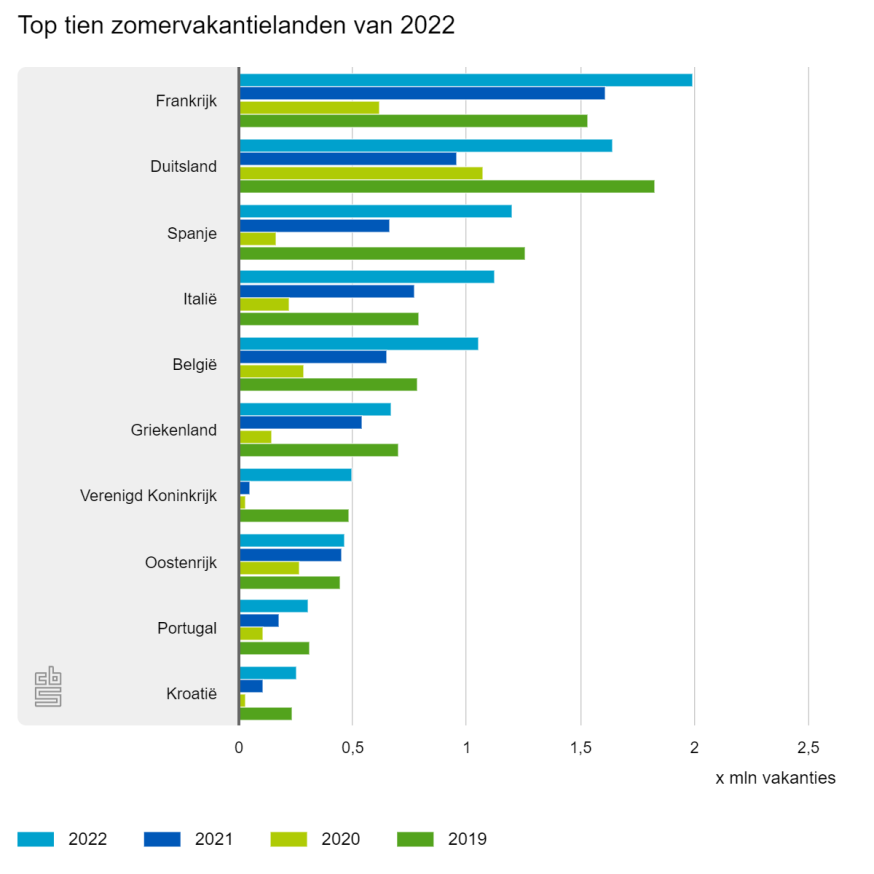Met bijna 2 miljoen vakanties was Frankrijk in de zomer van 2022 de populairste buitenlandse vakantiebestemming. Frankrijk heeft Duitsland (met 1,6 miljoen zomervakanties) ingehaald als meest bezochte zomervakantieland. In de zomer van 2019 -het jaar voor corona- trok Duitsland met 1,8 miljoen nog de meeste Nederlandse vakantiegangers. Voor Spanje, Portugal en Turkije was dit omgekeerd; deze landen waren in de zomer van 2022 juist minder in trek als vakantiebestemming. Turkije stond in 2019 nog in de top tien, met 381 duizend zomervakanties.