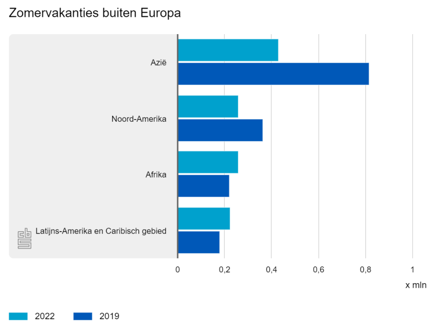 Buiten Europa zijn in 2022 ruim 400 duizend minder zomervakanties doorgebracht dan in het jaar voor de coronacrisis. Ruim 10 procent van de buitenlandse zomervakanties had een bestemming buiten Europa. In 2019 was dit nog 14 procent. Vooral het aantal zomervakanties naar Azië daalde ten opzichte van 2019, maar ook Noord-Amerika was minder in trek.