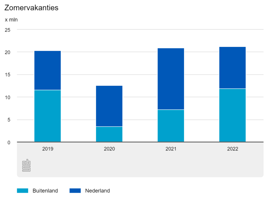 Het totaal van 21,2 miljoen zomervakanties was 0,9 miljoen hoger dan in 2019, het jaar voordat de coronapandemie uitbrak. In 2022 zijn 10,8 miljoen Nederlanders minstens een keer in de zomer op vakantie geweest. In 2019 waren dat er 10,7 miljoen. In 2022 had 56 procent van de zomervakanties een buitenlandse bestemming, ongeveer net zo veel als in 2019.