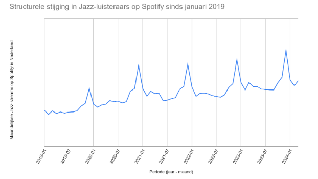 Zie hieronder de stijging van het aantal jazz streams door de jaren heen. De hoge pieken geven de feestdagen weer, wanneer jazz extra populair is. Zo wordt Michael Bublé met zijn album 'Christmas' ieder jaar erg goed gestreamd. Buiten de pieken om blijft de populariteit van het genre stijgen.