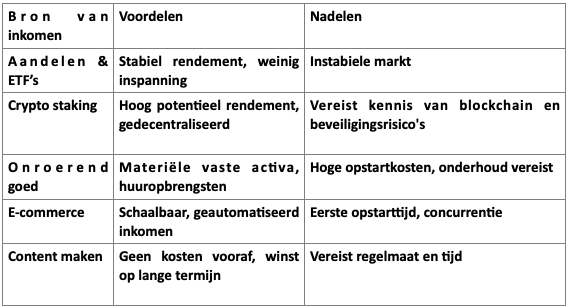 Het varieert. Beleggen in dividend en onroerend goed kan maanden tot jaren duren, terwijl digitale activa zoals eBooks of cursussen binnen enkele weken inkomsten kunnen genereren.