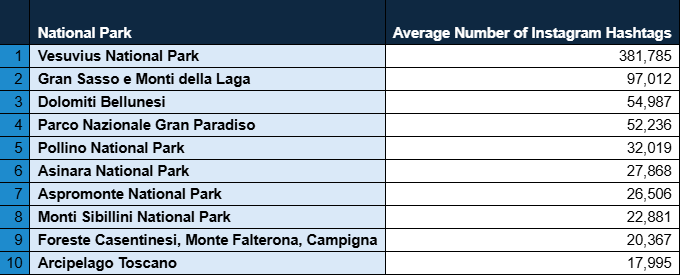 Onderaan de lijst staat Nationaal Park Appeninno Lucano- Val d'Agri-Lagonegrese, met gemiddeld 94 posts per geanalyseerde hashtag - wat 381.691 minder is dan het populairste park op de lijst (Nationaal Park Vesuvius).