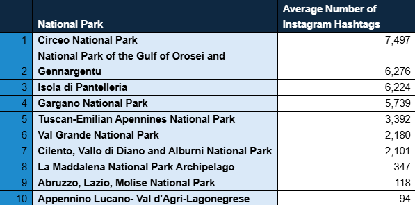 Nationaal Park Cilento, Vallo di Diano en Alburni staat op de vierde tot laatste plaats met gemiddeld 2.101 posts, en Nationaal Park Val Grande, gelegen in Noord-Italië op de grens met Zwitserland, staat op de vijfde tot laatste plaats met een Instagram postgemiddelde van 2.180.