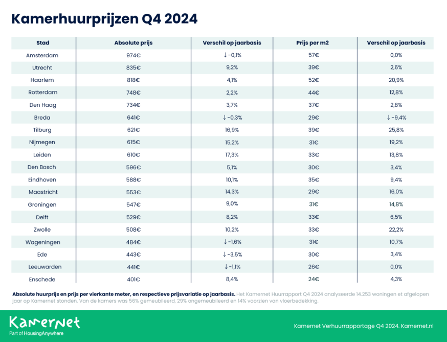 Op basis van alle geanalyseerde steden was de gemiddelde kamerprijs in het vierde kwartaal van 2024 € 705. Een jaar geleden was dit € 681. Studenten zijn het meest kwijt aan huur in Amsterdam, waar een kamer gemiddeld € 974 per maand kost, gevolgd door Utrecht (€ 835) en Haarlem (€ 818). De laagste huurprijzen zijn te vinden in Ede (€ 443), Leeuwarden (€ 441) en Enschede (€ 401).