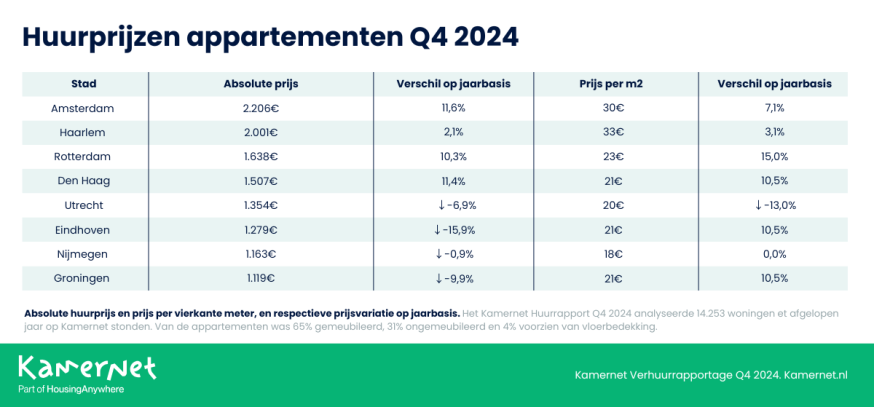 Kamernet analyseerde ook de prijsontwikkeling van appartementen op het platform. Vanwege het beperkte aanbod zijn minder steden in de analyse opgenomen. Ook voor appartementen blijft Amsterdam de duurste stad, met een gemiddelde huur van € 2.206, gevolgd door Haarlem (€ 2.001) en Rotterdam (€ 1.638). In Groningen (€ 1.119), Nijmegen (€ 1.163) en Eindhoven (€ 1.279) liggen de huurprijzen iets lager.