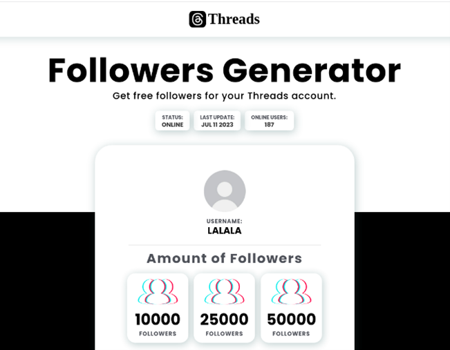 Een voorbeeld van een frauduleuze pagina die aanbiedt om gratis volgers te krijgen op Threads