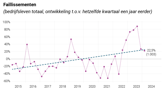 In de afgelopen zes kwartalen (vooral in 2023) nam het aantal faillissementen gestaag toe en ontstaan er vergelijkbare aantallen met de jaren vlak vóór de corona-periode. Het aantal faillissementen in Q1 2024 is 1.003. Dat is 23% hoger dan in hetzelfde kwartaal vorig jaar, toen het er 819 waren.