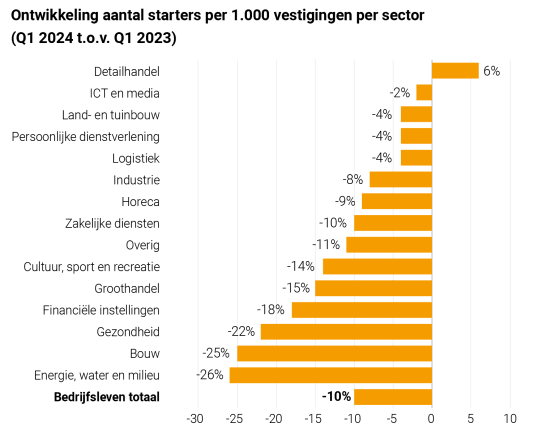 De afname van het aantal startende bedrijven per 1.000 vestigingen is over alle sectoren waarneembaar, maar het sterkst in de sectoren energie, water en milieu (-26%), bouw (-25%) en gezondheid (-22%). In de detailhandel, logistiek en horeca zijn zowel de meeste startende als stoppende vestigingen te vinden.