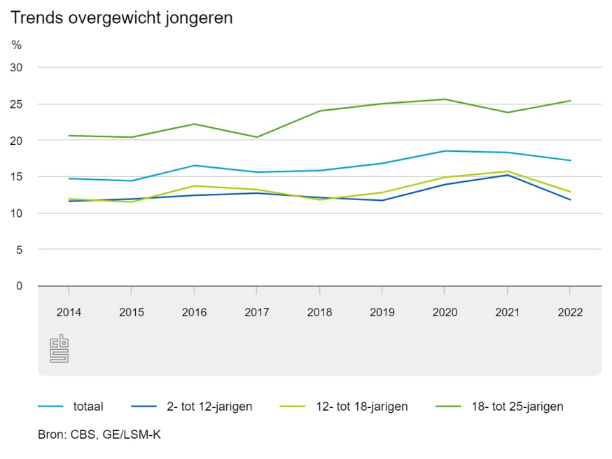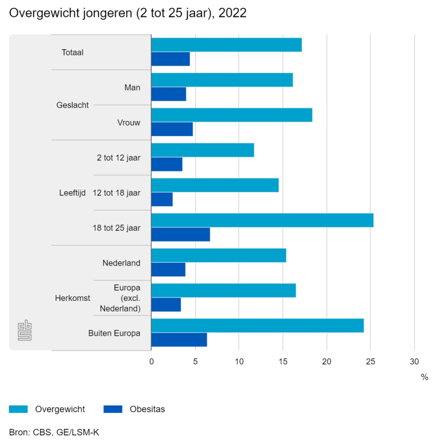 Van de kinderen en jongeren van 2 tot 25 jaar had 17 procent in 2022 overgewicht. Vooral 18- tot 25-jarigen zijn vaak te zwaar. Een kwart van deze jongeren had overgewicht, waarvan 7 procent ernstig overgewicht (obesitas). Dit meldt het CBS in het kader van de Landelijke Jeugdmonitor op basis van nieuwe cijfers uit de Gezondheidsenquête/Leefstijlmonitor 2022, in samenwerking met het RIVM.