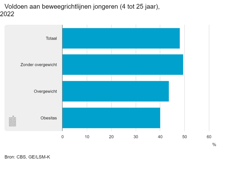 Bijna de helft van de jongeren van 4 tot 25 jaar voldoet aan de beweegrichtlijnen die zijn opgesteld door de Gezondheidsraad. Kinderen van 4 tot 12 jaar voldoen vaker aan de beweegrichtlijnen dan jongeren van 12 tot 18 jaar (57 tegen 33 procent). Onder 18- tot 25-jarigen voldoet 51 procent aan de richtlijnen.