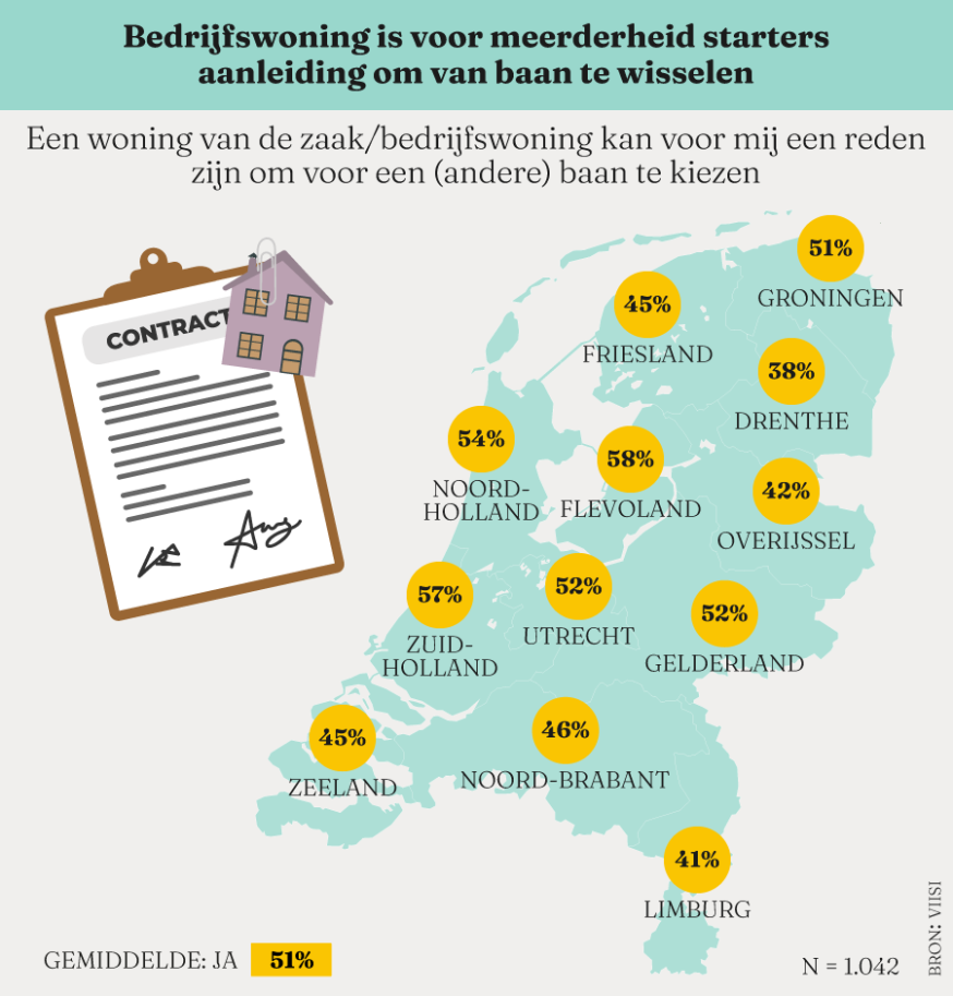 Vooral twintigers zijn een voorstander van een zogenoemde woning van de zaak. Voor maar liefst 54 procent van hen zou dit een reden zijn om van werkgever te wisselen, 62 procent is zelfs bereid hiervoor te verhuizen. “Torenhoge huizenprijzen en een steeds kleiner aanbod koopwoningen, voor veel starters raakt de droom van een eigen koopwoning steeds verder uit het zicht”, zegt Hergen Dutrieux, medeoprichter van Viisi Hypotheken. “Ondanks grote plannen lukt het vooralsnog niet om de woningmarkt vlot te trekken. Deze resultaten laten zien dat er onder Nederlandse starters voldoende draagvlak bestaat voor creatieve oplossingen vanuit bijvoorbeeld werkgevers én dat een groot gedeelte van hen zelfs bereid is hiervoor te verhuizen.”