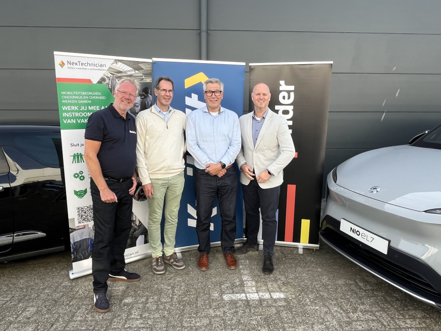 Vlnr: Richard ten Damme, Head Learning & development bij KwikFit, Jacques Neefs, projectleider bij NexTechnician Amsterdam, Paul Traas, ceo bij KwikFit en Ben van Gorp, projectleider bij Yonder Tilburg.